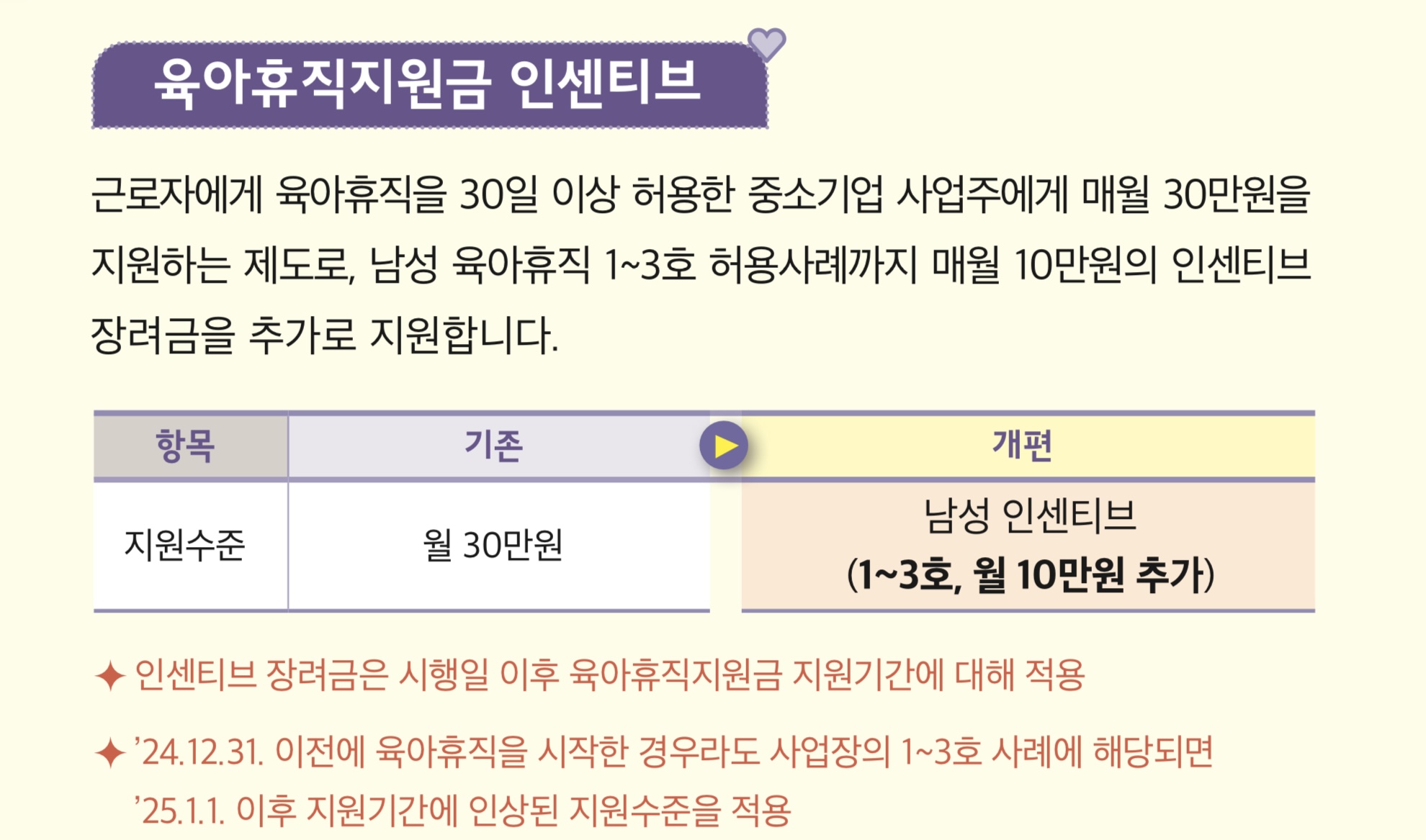 근로자에게 육아휴직을 30일 이상 허용한 중소기업 사업주에게 매월 30만 원을 지원하는 제도로, 남성 육아휴직 1~3호 허용사례까지 매월 10만원의 인센티브 장려금을 추가로 지원한다.