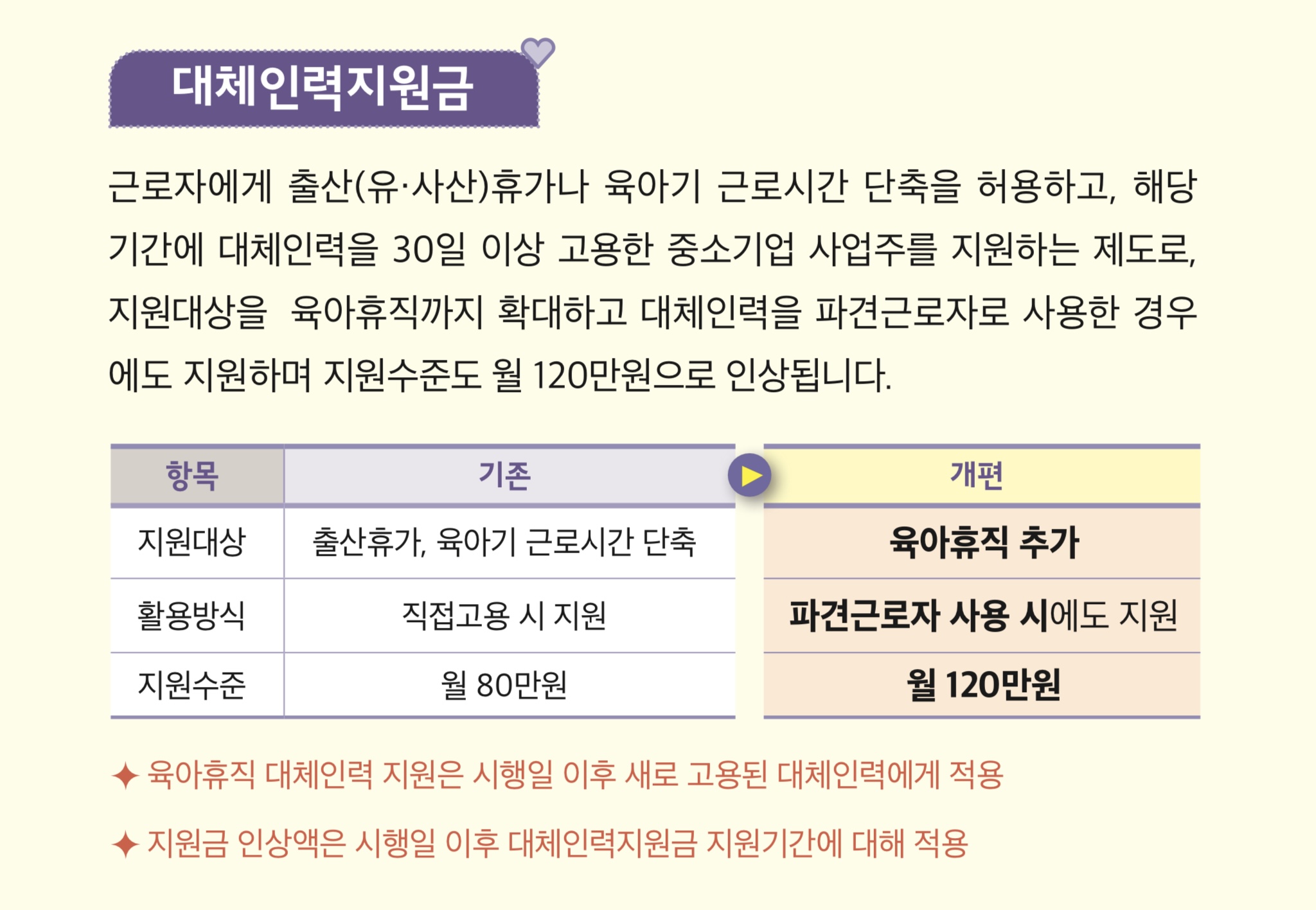 출산전후휴가 또는 육아기 근로시간 단축, 육아휴직을 허용하고, 대체인력을 30일 이상 고용한 중소기업 사업주에게 월 120만 원 지원하는 제도이다. 지원대상을 육아휴직까지 추가되어 월 80만 원 -> 월 120만 원으로 상향됩니다.