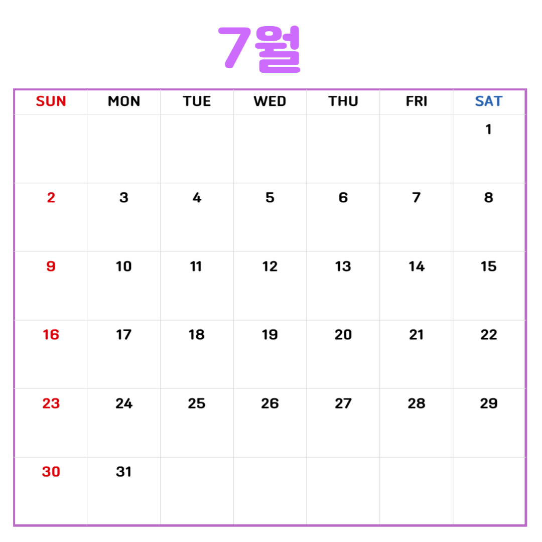 본격적인 여름휴가 시즌인 7월 달력 및 공휴일